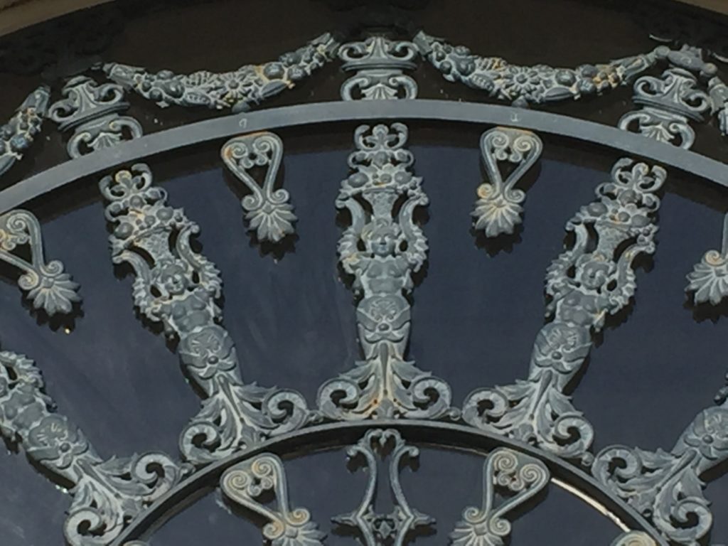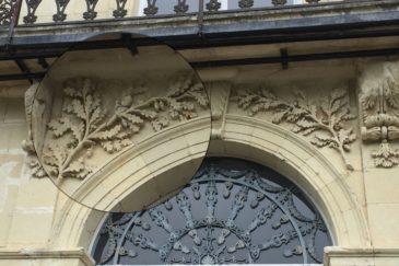 On retrouve également, de part et d’autre de la porte centrale, des rinceaux sculptés en relief constitués d’arabesques de feuillage représentant des rameaux d’olivier, symbole de la paix ou de la victoire. Les portes-fenêtres cintrées en rez-de-terrasse sont ornementées de clés d’arc sculptés, soit de feuilles d’acanthe qui est une fleur sauvage du sud de l’Europe, soit de petites feuilles lobées.
