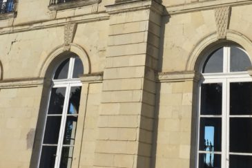 L’édifice garde de l’époque Louis XVI une façade dépouillée, obéissant à une rigoureuse symétrie, l’abandon des hautes toitures, occultées, à leurs rives, par un acrotère agrémenté de jours en balustres, la survivance discrète d’un troisième niveau en attique, la légère mouluration des entourages de fenêtre, la disparition de l’avant-corps central en saillie, enfin, un entablement puissant avec architrave largement déployé à la Corinthienne, courant rigoureusement sur toutes les façades.